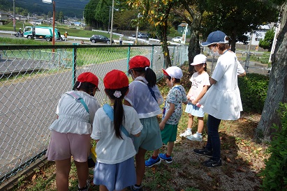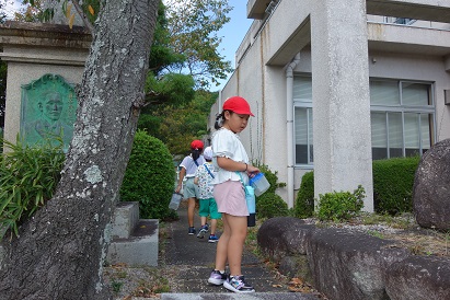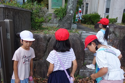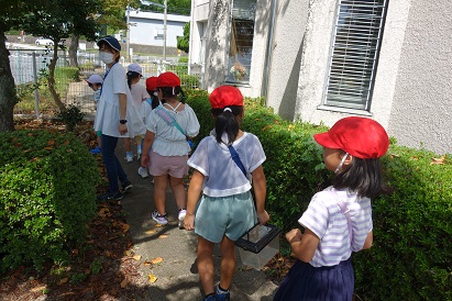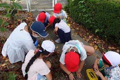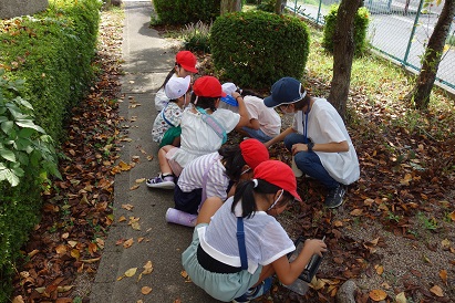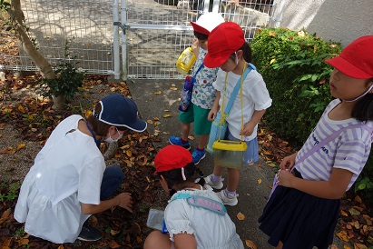 1年生が生活科の学習で虫をさがしていました。お目当てはトカゲ、ダンゴムシなど・・・「落ち葉や石の下にいないかな」「あ!ダンゴムシの赤ちゃん発見!」と見せてくれました。