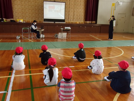 津市交通教育プロバイダの方に来ていただき、交通安全教室を実施しました。1・2年生は、9時30分から体育館で歩行についての講話と