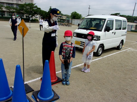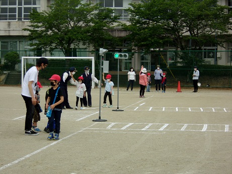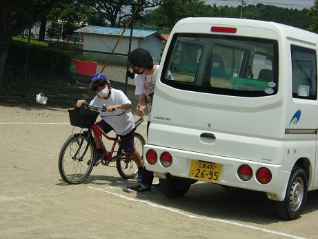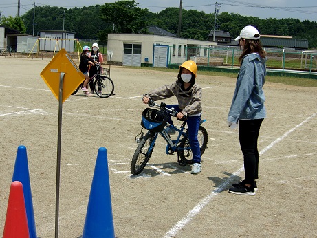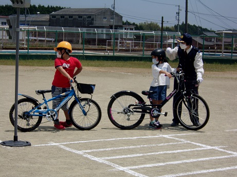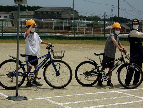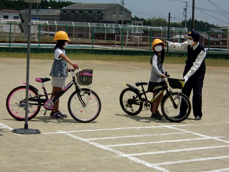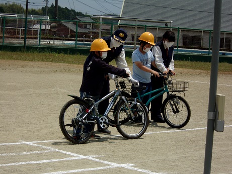 視聴の後、運動場で自転車に乗って練習しました。交通ルールを守って「自分の命は自分で守る」ということの大切さを教えていただき、安全な歩行、安全な自転車の乗車について学ぶことができました。交通安全父母の会の会長さん、副会長さんにもお手伝いいただきました。ありがとうございました。