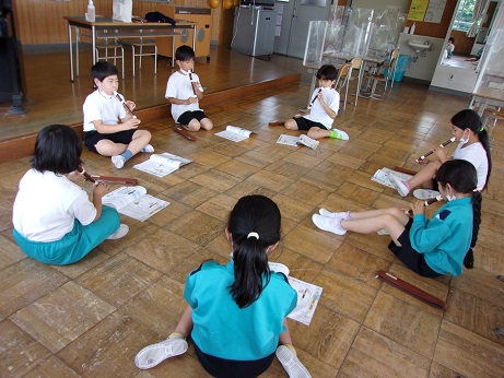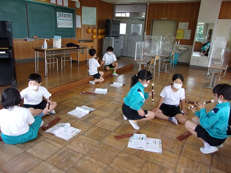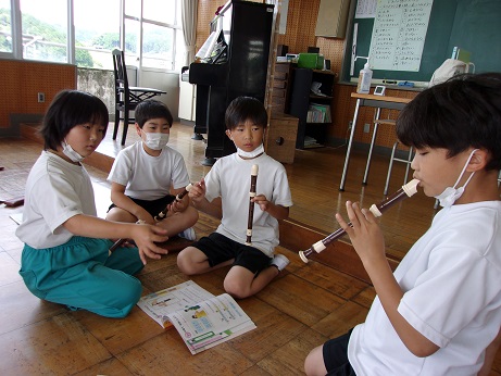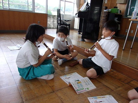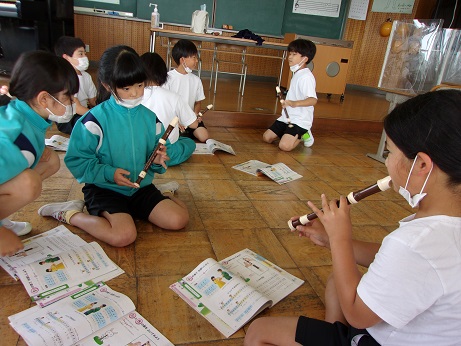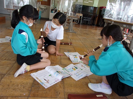 音楽科では、3年生からリコーダーの学習が始まっています。今日の授業では、リコーダーに自信がない子は、友だちの指使いを近くで見たり、教えてもらったりしながら練習を進めていました。リコーダーを吹くとき以外はマスクを着用し、グループで練習し終わった後は、手指消毒をしたりするなど、感染症対策に気をつけて取り組んでいます。吹き方の指使いを習った音は、まだ「シ」と「ラ」だけですが、これからいろいろな音を習い、曲のレパートリーが増えていくのでしょう。どんな曲を聴かせてくれるのか楽しみです!