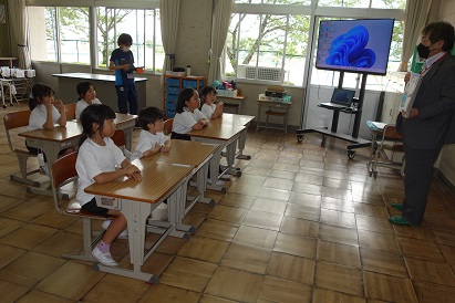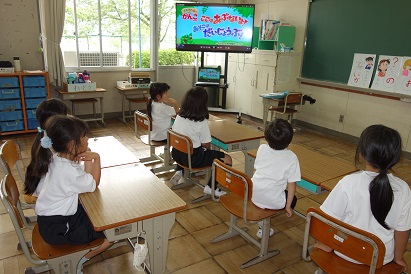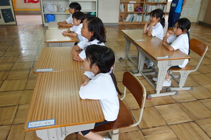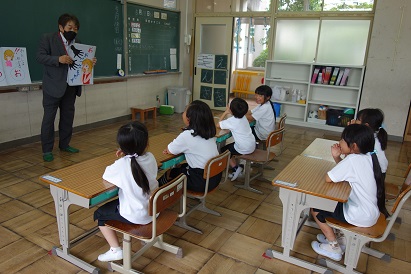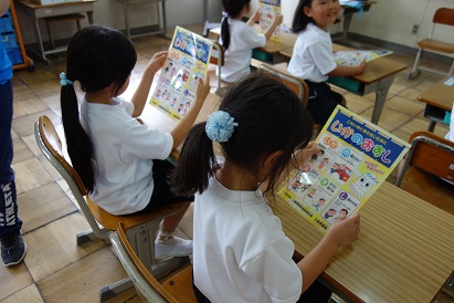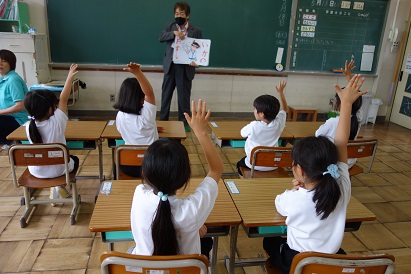 1年生が津警察署安全課による誘拐防止教室を実施しました。誘拐にあわないために「いかのおすし」(いかない、のらない、おおごえでさけぶ、すぐしらせる)と覚えておこうと教えていただきました。