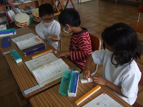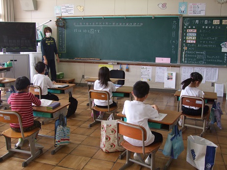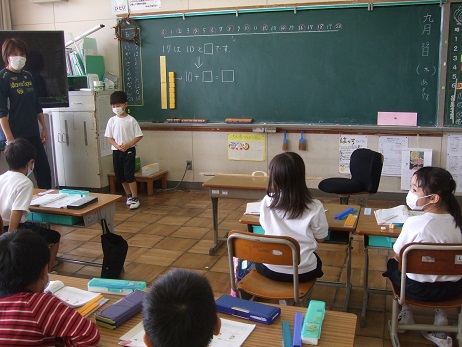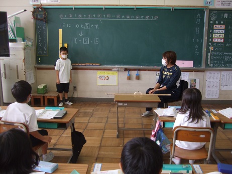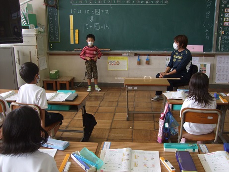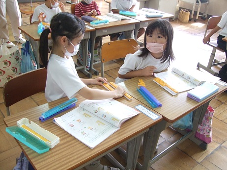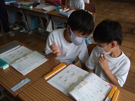 今日、1年生の算数ではペアになって、友だちと相談したり、考えを話したりしながら学習を進めていました。ペアで互いに自分の考えを伝え合うことが、みんなの前で自信をもって話せることにつながります。また、わからないことは教え合ったり、一緒に考えたりすることで、より思考が深まることも期待できます。話すこと、聞くこと、どちらも大切な活動です。ペア学習と全体での学習、それぞれの時間に繰り返し取り組むことで、基礎的な力をしっかりと身に付けていってほしいと願っています。