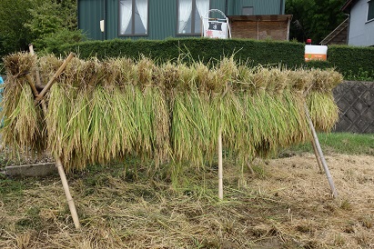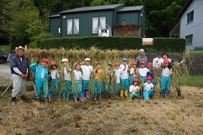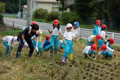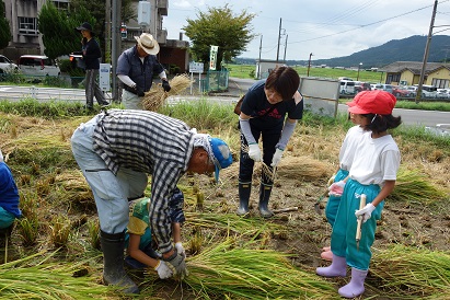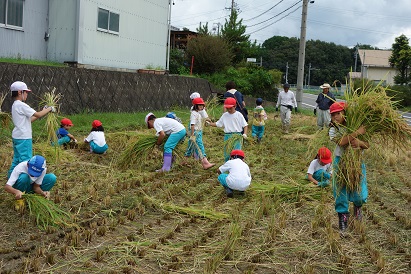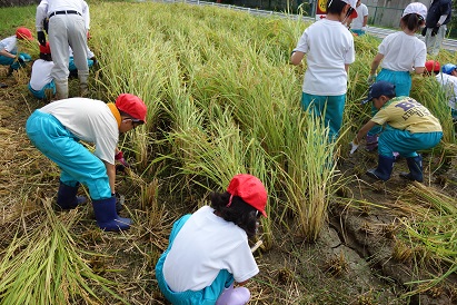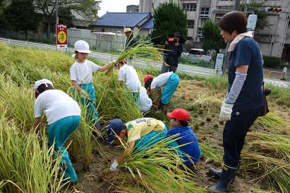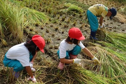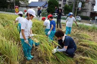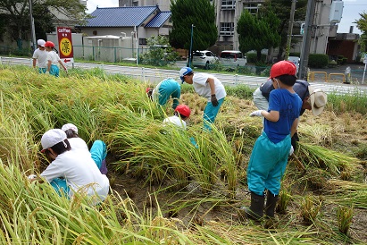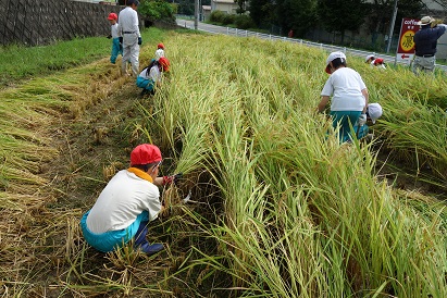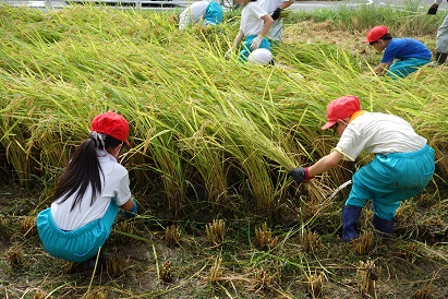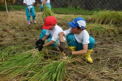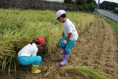 地域の方のご協力のもと、稲刈りを体験しました。今日は、稲を鎌で刈り、束ねて干すところまで教えていただき、実際にやってみました。5月には田植え、9月には稲刈りを体験させていただき、稲作の大変さを実感することができました。暑いなか丁寧に教えてくださり、ありがとうございました。