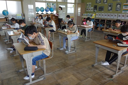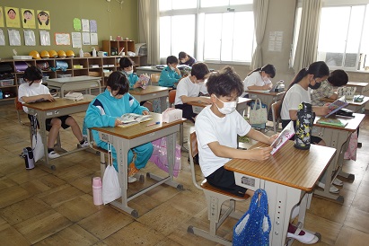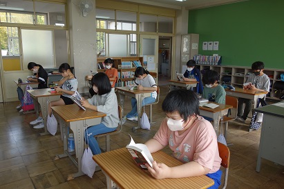 草生小学校では8時20分から8時30分までを「朝読書」の時間とし、読書に親しむ習慣づくりとして続けています。1日の授業の始まりを落ち着いた雰囲気でスタートできるという効果もあります。自分で選んだ本をみんな静かに読んでいます。