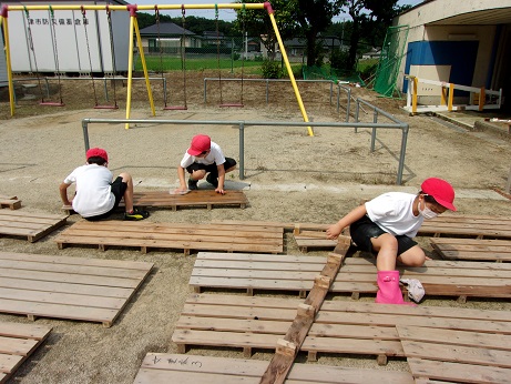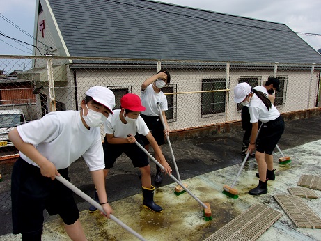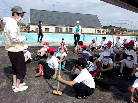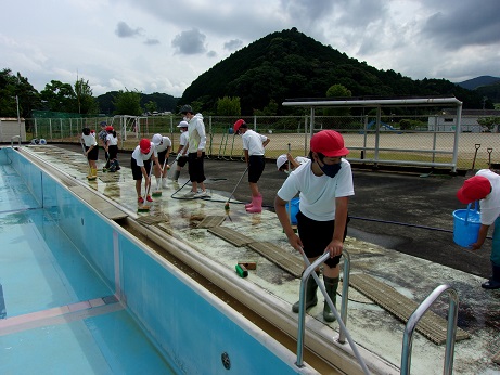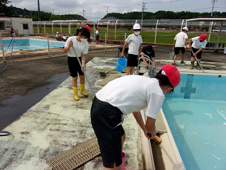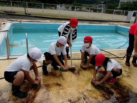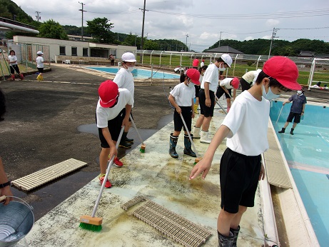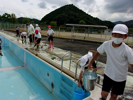 年生の力で一年間のプールの汚れを落としました。一人ひとりが一生懸命、掃除をしてくれたおかげで、予定より早くきれいになりました。ありがとう!