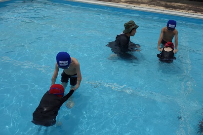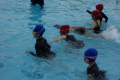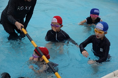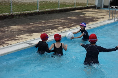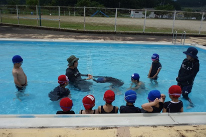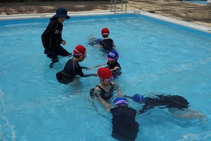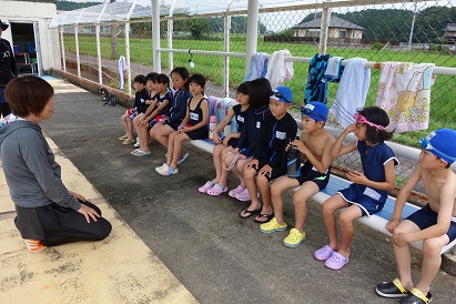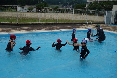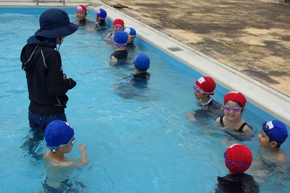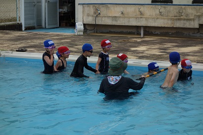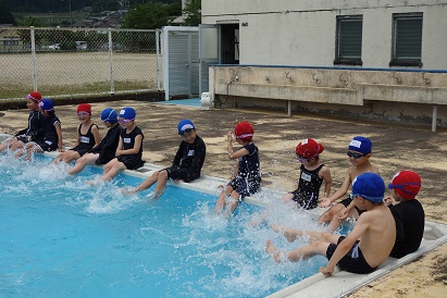 3・4限目に1・2年生が小プールで、3・4年生が大プールで水泳の授業を実施しました。薄日が差し、気温も30℃近くあり、この時期としては、まずまずの水泳日和になりました。1年生は小学校で初めての水泳、2年生は今年度初めての水泳でした。プールサイドで、水泳の授業の約束やめあてなどを確認し、ペアになって入水しました。プールの中を歩いたり、肩まで、鼻まで、頭までと順番にもぐったり、貝拾いをしたりするなど、水に十分慣れるよう活動しました。自由時間には、輪くぐりやボール遊びをしたりして楽しく過ごしました。3・4年生は3回目なので水泳の授業にも慣れ、段取りよくできるようになってきました。今日はふし浮きにチャレンジしました。笑顔がいっぱいの楽しい水泳の時間となりました。
