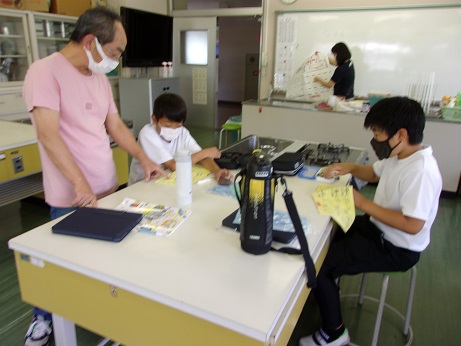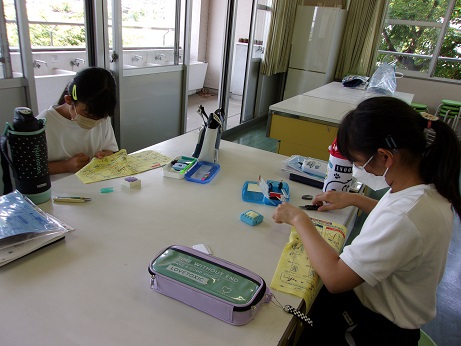 年生になって新たに加わった学習、家庭科で、玉結び、玉止めの練習をしました。上手にできるようになってきたので、自分の名前をカタカナで縫いました。その後、なみ縫いの練習もしました。初めて糸と針を使う子、これまでにもやったことがある子がなど経験はさまざまでしたが、みんな真剣な表情で、一生懸命取り組んでました。今後、半返し縫い、本返し縫いなどにもチャレンジします。
