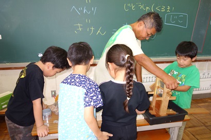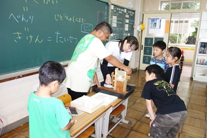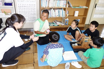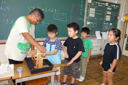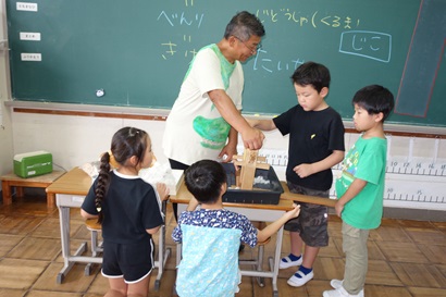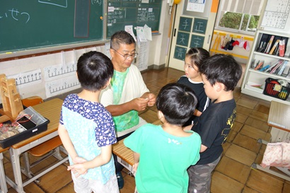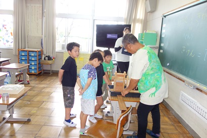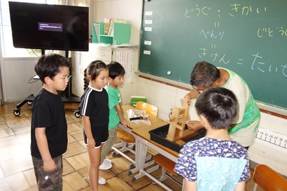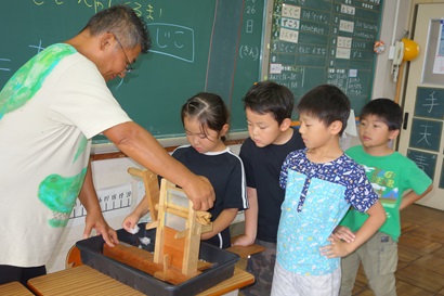 綿づくり名人にゲストティーチャーとしてご来校いただき、1年生が綿の種取り機を使って綿から種を取り除く方法を教えてもらいました。機械を使うと素早く綿から種を取り出せることに驚いていました。