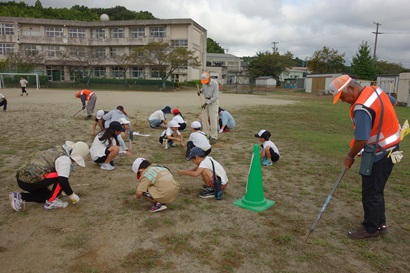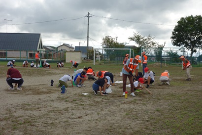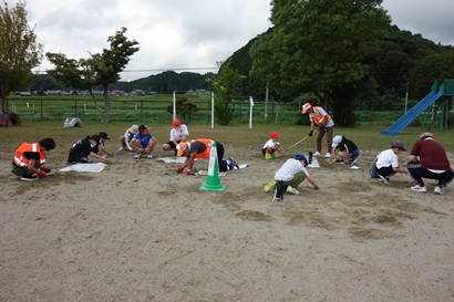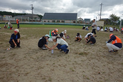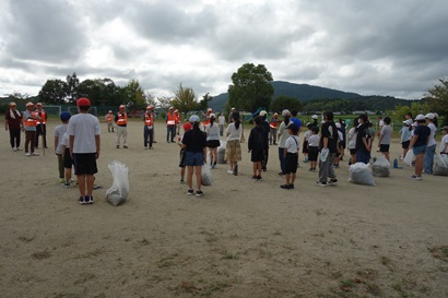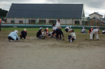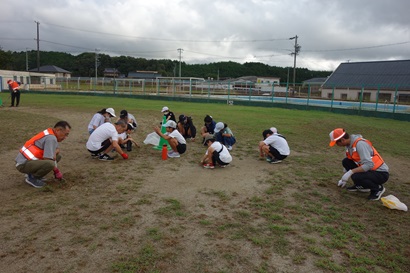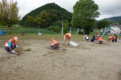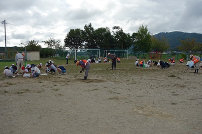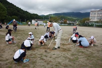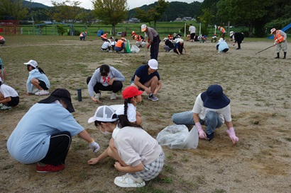 見守り隊のみなさまと全校児童が運動場の草取りを行いました。見守り隊のみなさまには、登校の見守り活動に引き続き、草取りをしていただきました。おかげさまで草取りが随分はかどりました。ありがとうございました。