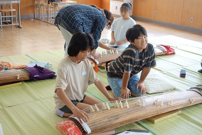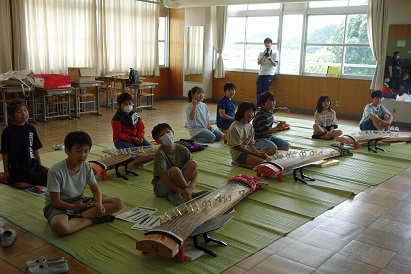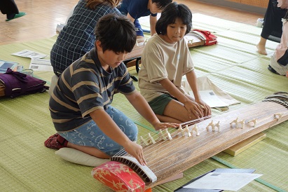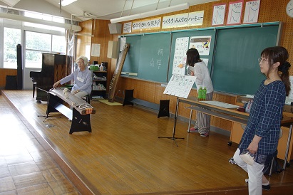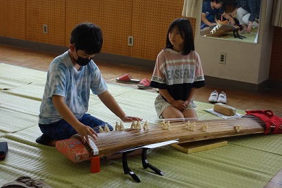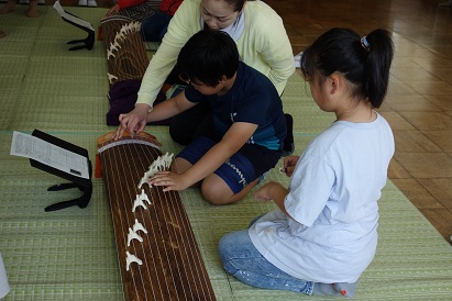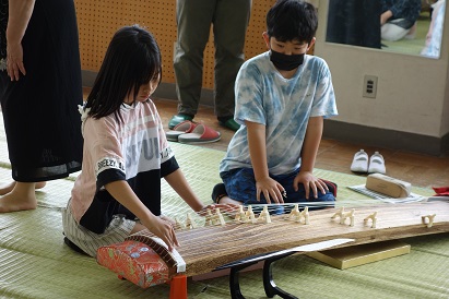 普段から箏を習っている友だちと箏の先生が一緒に箏を弾く演奏を聴かせていただきました。最後に箏の演奏でとなりのトトロの「さんぽ」をみんなで歌いました。見て聴いて自分で弾いてと、和の音色に親しみ、楽しく体験することができました。