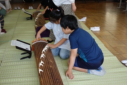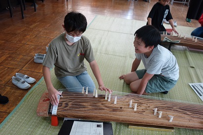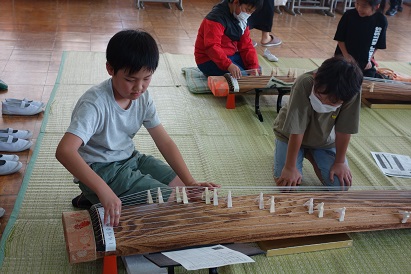 5年生が「箏体験」として、箏の各部の名称や音の出る仕組み、弾くときの姿勢や爪のつけ方を学び、実際に「さくらさくら」の弾き方を教えていただきました。二人一組になって順番に練習しました。「さくらさくら」が弾けるようになってくると、「楽しい!」と満足な様子でした。途中で、