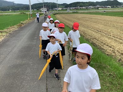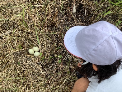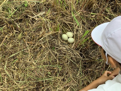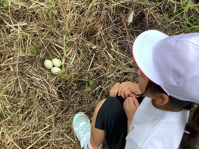 の巣を見に行きました。その巣は、学校の技能員さんが見つけて教えてくれました。見つけたときは、たまごは8個あったけれど、今は3個だけになっていました。「ヘビに食べられたのかな」 子どもたちは、キジがこのような場所に巣を作るということやキジのたまごは思ったより小さいことなど初めて知ったようです。