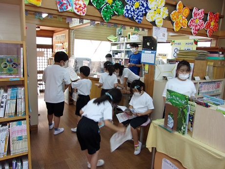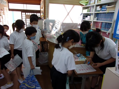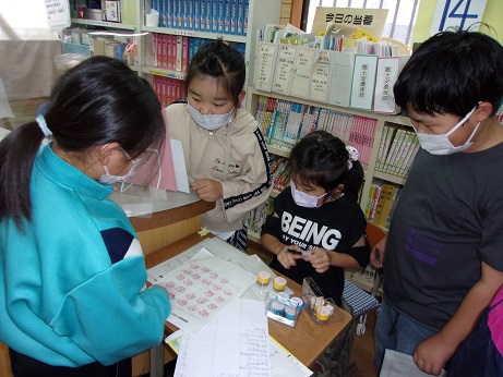 図書館まつりでは、ビンゴシートに書かれた図書館の本に関係する課題をクリアするとスタンプが押してもらえます。縦、横、斜めのいずれかがそろえば、図書委員さんお手製のしおりがもらえます。図書館に足を運ぶ機会が増える楽しい企画です。