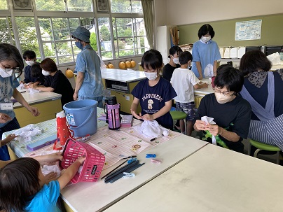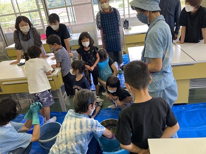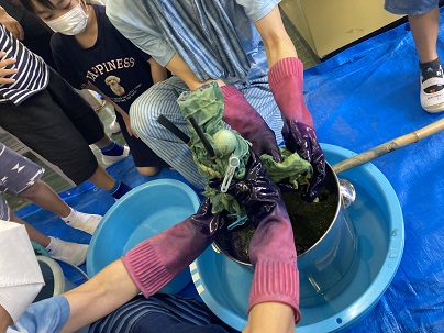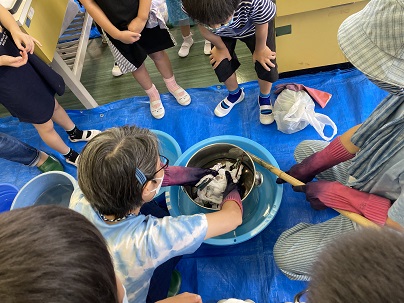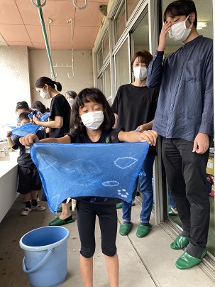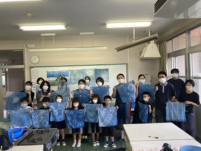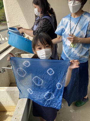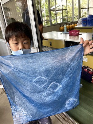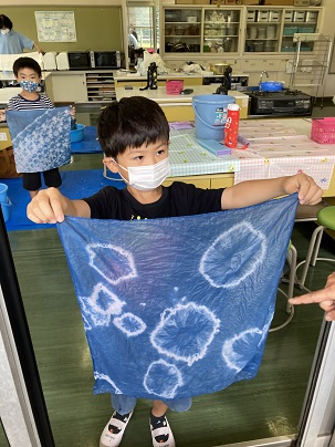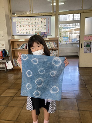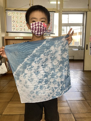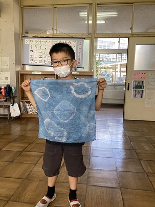 PTAふれあい教室で、ゆうづる会さんにお越しいただき、1年生と保護者が藍染を体験しました。「藍」を自分たちで育てているので、より身近な気持ちで意欲的に活動することができました。染め上がったハンカチを校長室まで見せに来てくれました。同じように染めても一人ひとり違う色、違う模様! 上手にできたね! ハンカチが素敵に染め上がり、みんなとても嬉しそうでした。保護者のみなさまも一緒に体験していただき、ありがとうございました。 ※お礼の手紙より子どもたちの感想を一部紹介します。