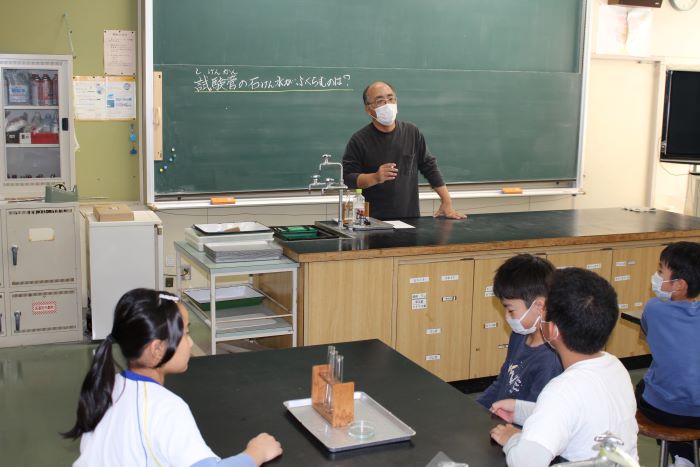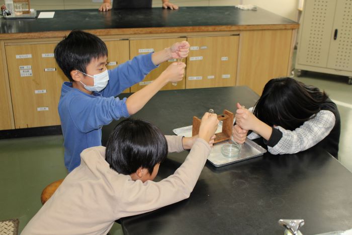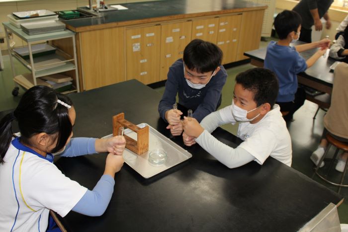 試験管の口に石鹸水をつけて、試験管を手で握って温めると、石鹸水が膨らんできます。