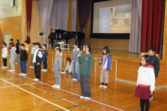 最初に11月の歌である「まっかな秋」を全校で歌いました。