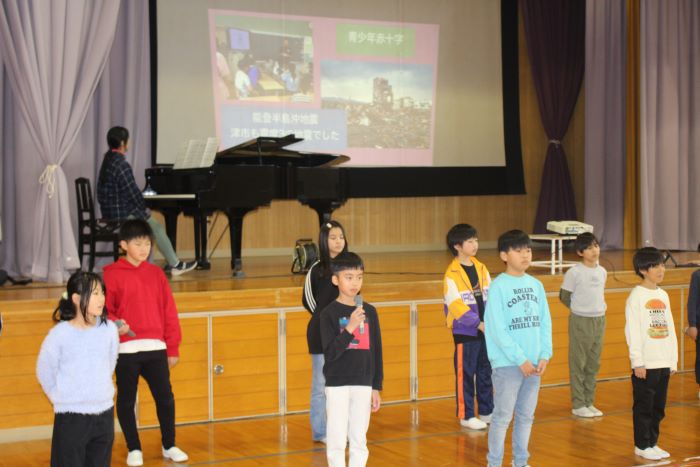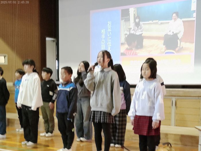 次に、4・5年生が今までの防災学習や出会い学習で学んだことや考えたことを発表しました。