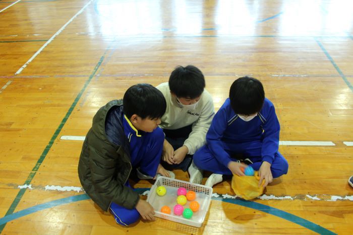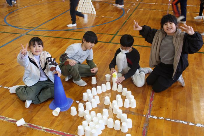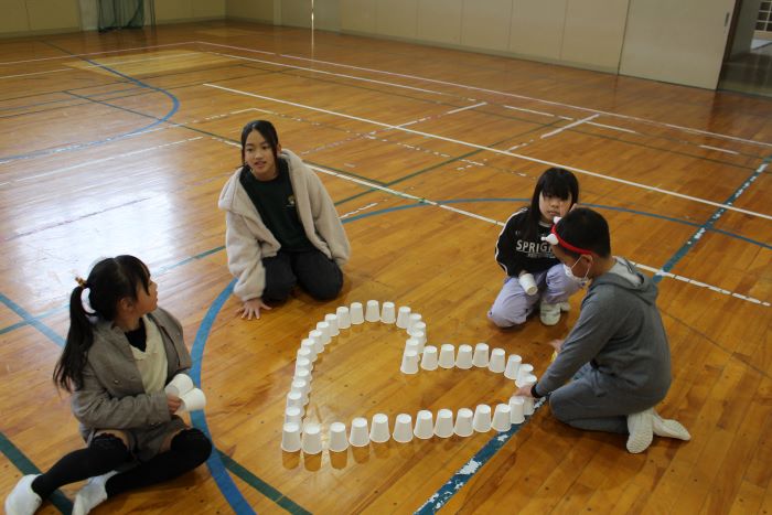 最後に縦割り班に分かれて「紙コップアート」を行いました。班で協力しながら、紙コップを並べることができていました。