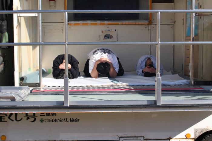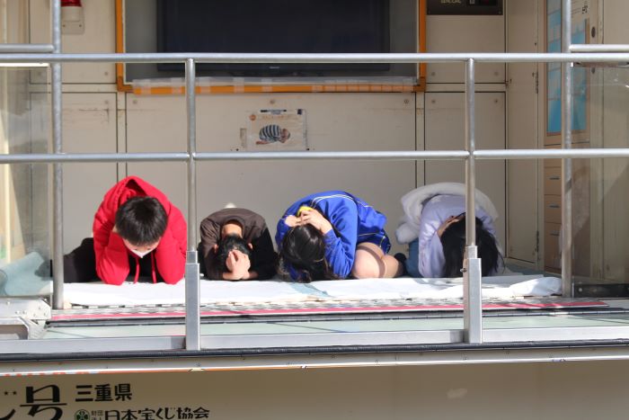 地震体験車では震度5~7を体験しました。乗る前は、不安を感じている児童もいましたが、みんなしっかりとダンゴムシのポーズを保つことができていました。