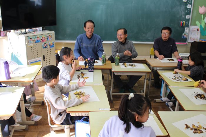 サツマイモの栽培でお世話になった打田さんと田中さん、焼き芋作りを手伝ってくださった用務員の土佐川さんを招待して、焼きいもパーティーをしました。