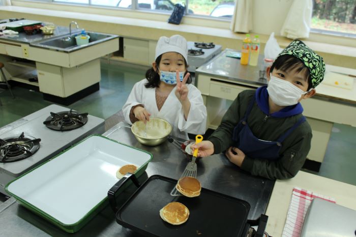 サツマイモのバター煮、グラタン、うどんの3品を作りました。限られた時間の中で、協力しながら調理することができていました。
