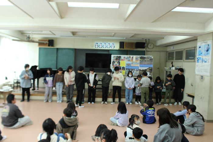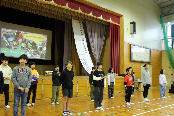 4・5年生は防災学習で学んだこと考えたことなどを地域の皆さんの前で発表しました。