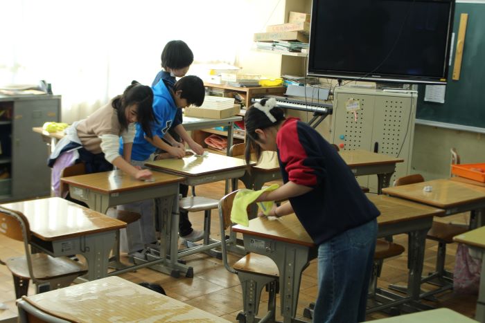 前半は自分たちの机や引き出しなどをきれいにし、その後、教室の掃除を行いました。