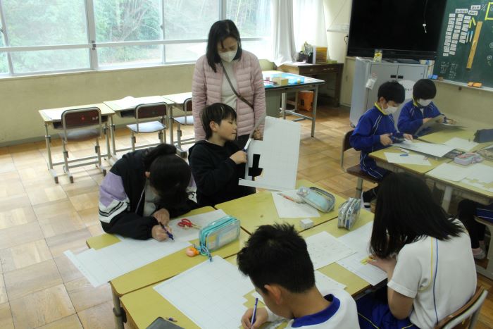 直方体や立方体の学習をしています。展開図を切り取って、立体になるかを確認しています。