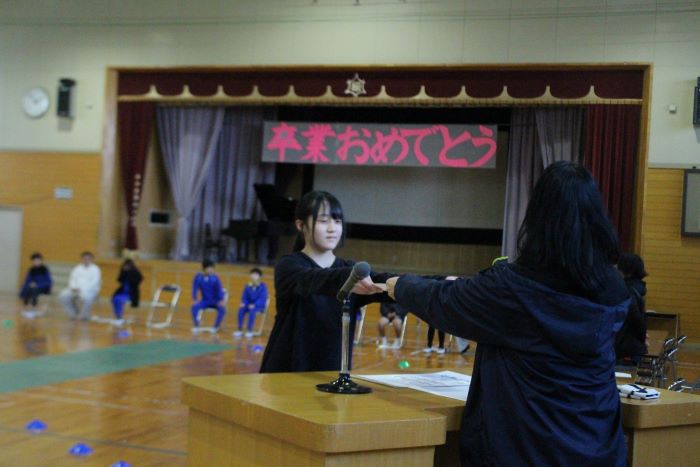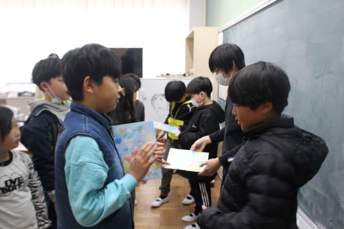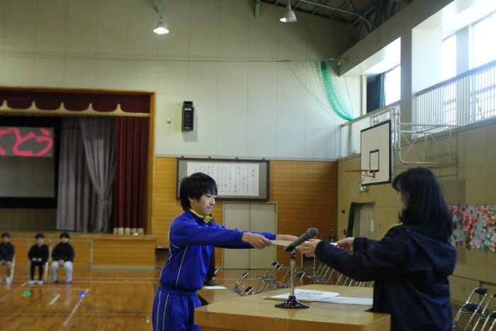 在校生から6年生に、メッセージを書いた色紙を渡しました。