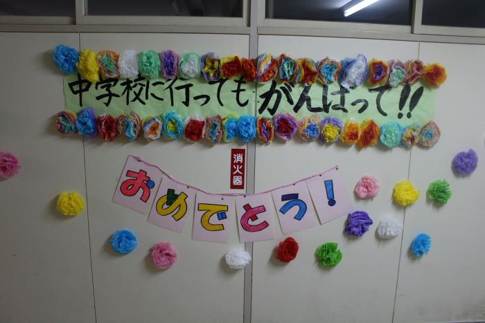 例年は4・5年生が卒業式の準備をしているのですが、今年は在校生1~5年生全員で飾りつけや式場の準備をしました。