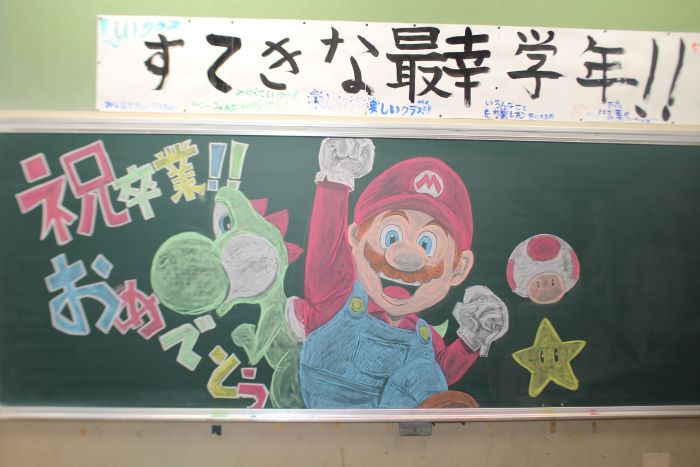6年生の教室の黒板アートです。6年生の担任の先生が1時間以上の時間をかけて描き上げました。