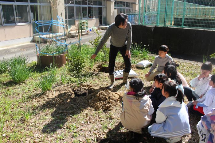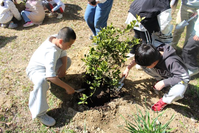 校舎の裏に3本のみかんの木の植樹をしました。