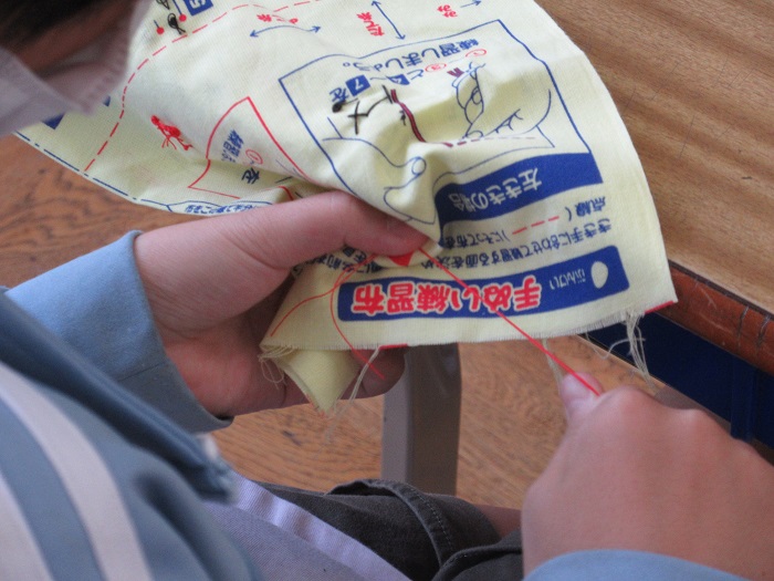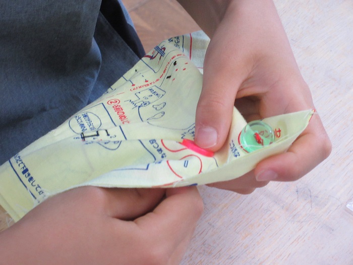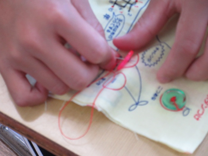 5年生は家庭科の授業で、四つ穴ボタンを付けました。