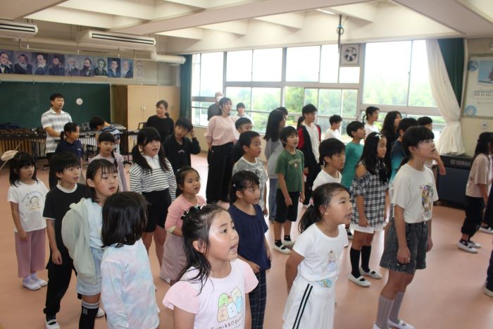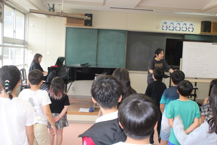 5限目に全校児童が音楽室に集まり、くしがたコンサートの練習を行いました。