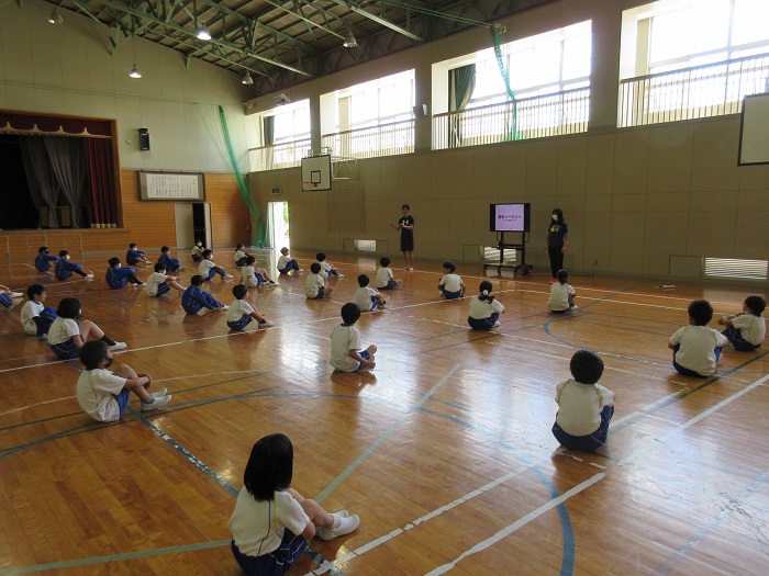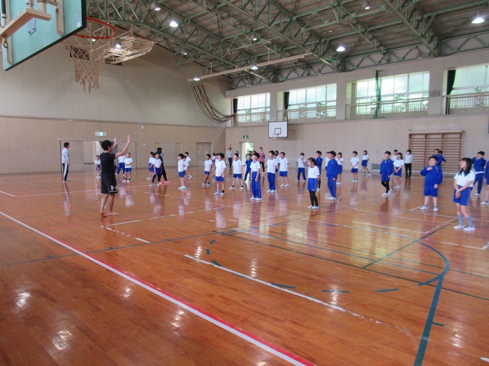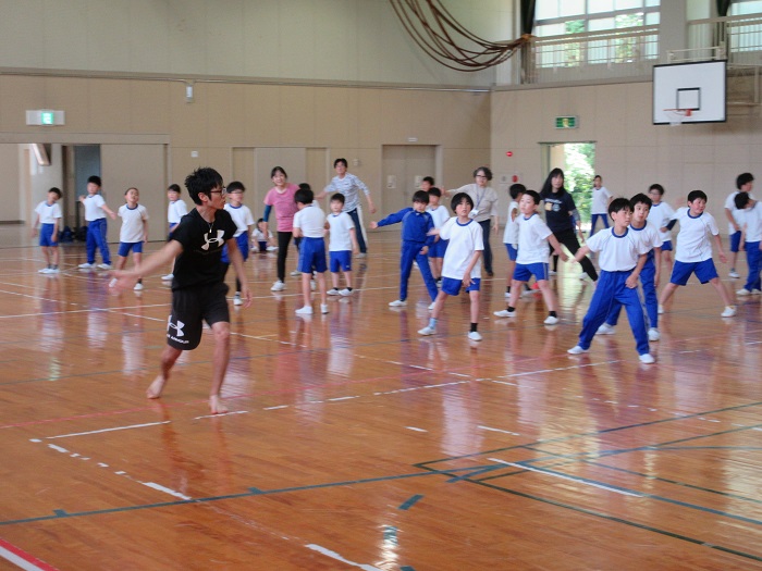 ↑メリハリのある動きが大切だと教えてもらいました。掛け声をかけながらヒジを伸ばして手を素早く振ると、とても「かっこよく」見えました。教員も子どもたちも練習に熱が入りました。