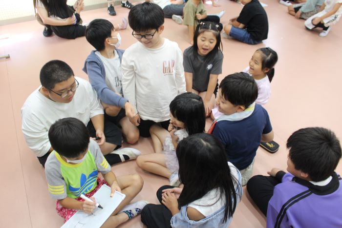 先生や児童会役員がするジェスチャーを見て、子どもたちは縦割り班で相談して答えを考えました。