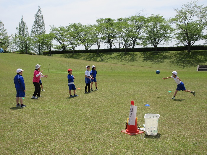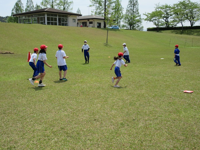 ↑芝生広場で、縦割り班遊びをしました。遊びの内容は、事前に各班の6年生が考えてくれていました。「だるまさんが転んだ」「おにごっこ」「中あて」「しっぽとり」などなど…。どの班も協力して、とても楽しそうに遊んでいました。