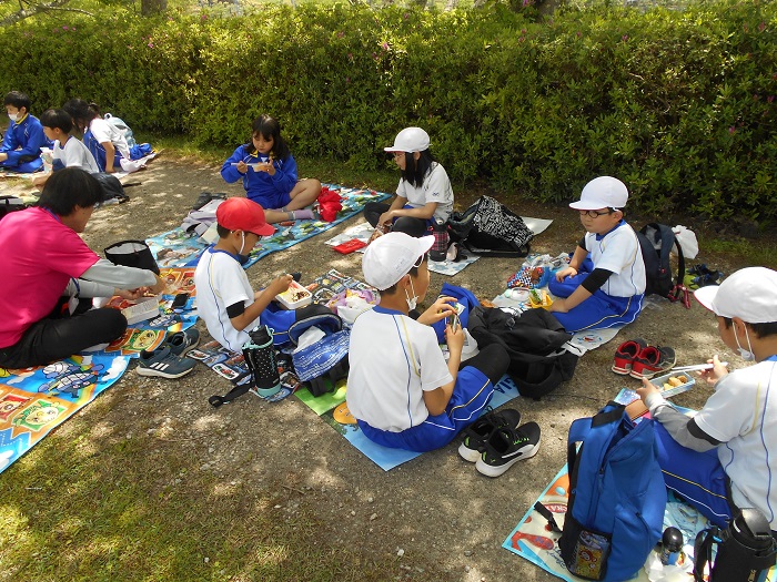 ↑お弁当の時間です。たくさん遊んで火照った体が、木陰に入ると少しひんやりとして気持ちよかったです。同じ班の子と一緒に、おいしくお弁当をいただきました。