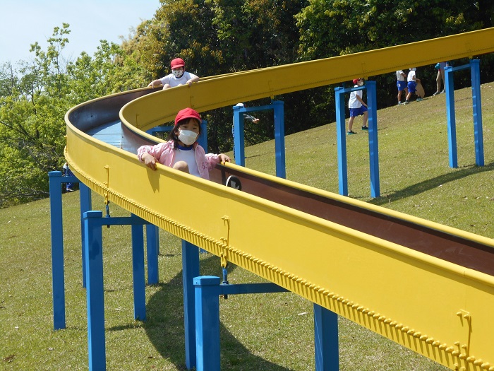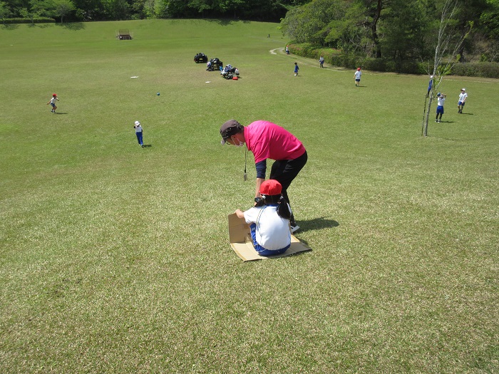↑食後は、自由遊びの時間になります。友達と声を掛け合って、遊具のすべり台に行く子もいれば、ボールを使って遊ぶ子、段ボールで斜面を滑る子など、思い思いに楽しんでいました。