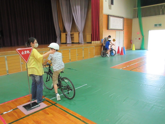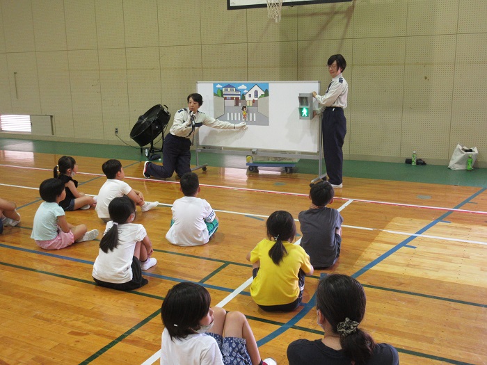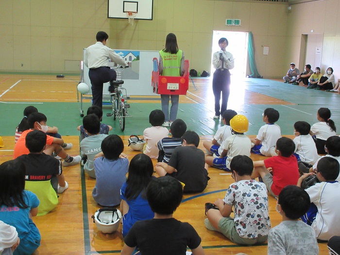 7月6日(木)に交通安全教室を行いました。1~2年は歩く時について、3~6年は自転車に乗る時の注意について、学習をしました。