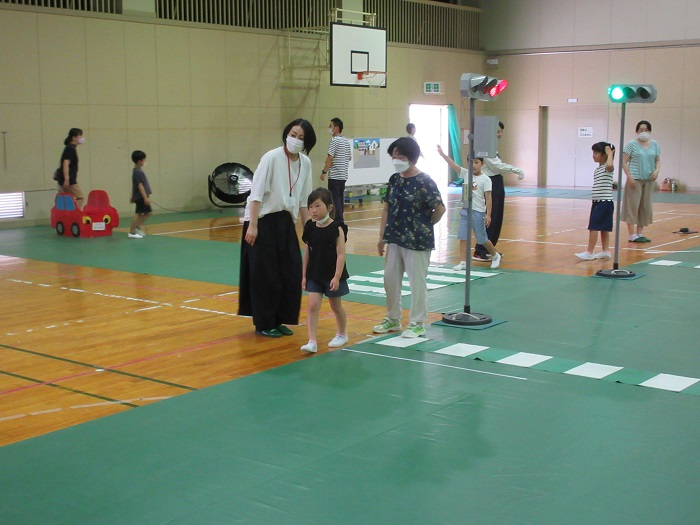 ↑お話の後、体育館に作ったコースを実際に歩いてみました。PTAのボランティアの方に見守られ、教えてもらったことを守って歩くことができました。