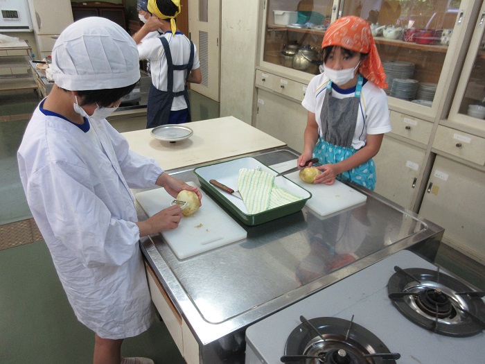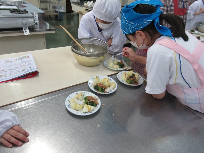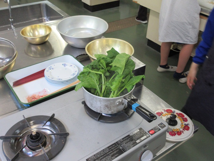 5年生が家庭の時間に、調理実習を行いました。作ったのは「青菜のおひたし」と「ゆでいも」です。
