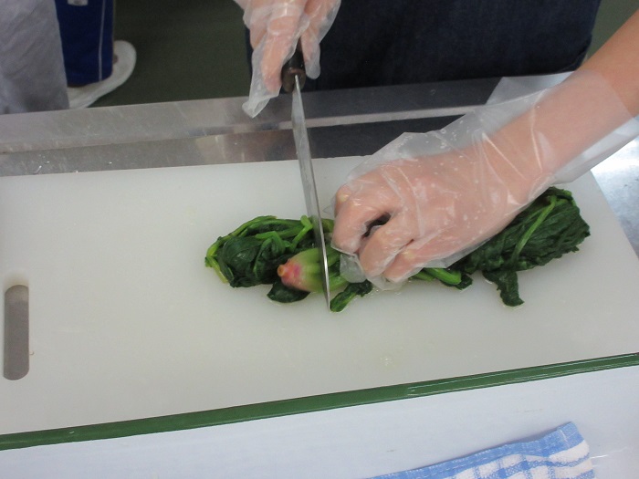 ↑茹で上がったほうれん草を、水につけて冷ましました。そのあと4cm~5cmくらいにカットしていきます。「5cmって、どのくらいやろ?」「先生、くきの下のピンクのところって、食べられるの?」いろんな確認をしながら調理を進めます。