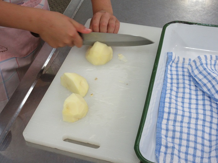 ↑皮をむいたジャガイモを、食べやすいサイズに切ってから茹でていきます。包丁を使うとき、ちゃんと「猫の手」になっていますね。