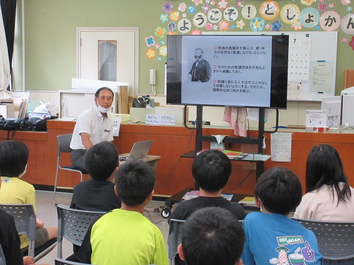 日本赤十字三重県支部の方に講師として来ていただき、5・6年生が「国際人道法」と「赤十字の7つの原則」について学習をしました。
