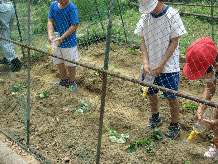 ↑つるさしが終わったら、水やりをします。「これからは毎日、朝と帰る前に、しっかりと水をあげてね。」