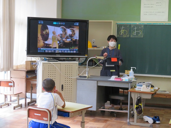 ↑給食を作る様子の動画を見せてもらいました。調理器具の大きさなどに、みんな興味津々でした。