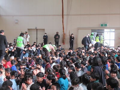 2限目に中学校と合同で避難訓練を行いました。避難の指示が入ると子どもたちは口を押え、姿勢を低くし、しゃべらずに速やかに非難ができました。来ていただいた消防署の方からも後から「子どもたちの避難するときや待っている時の姿にびっくりしました。」とお褒めの言葉をいただきました。