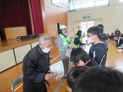▼児童から手紙と花を渡します