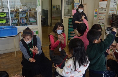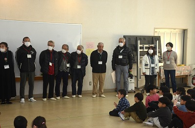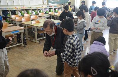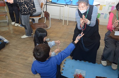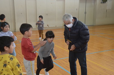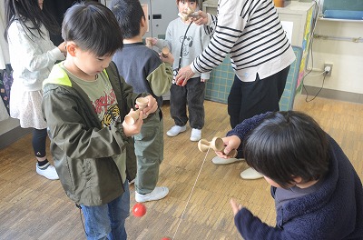 南が丘コミュニティ・ネットの皆さんに来ていただき、あやとび・ぶんぶんごま・たけとんぼ・こままわしなど昔からの遊びを体験させていただきました。
